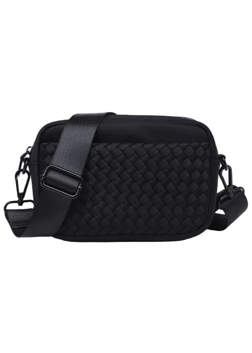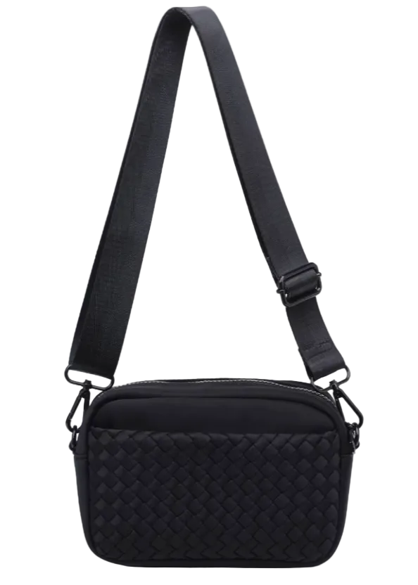 The Inspiration Woven Neoprene Crossbody by Sol and Solene integrates fashion and function while providing a place to store your lip gloss, keys, and other must haves. It features an adjustable shoulder strap, zippered top, two side pockets, and an inner slip and zip pocket. The woven neoprene design is lightweight and the perfect everyday bag.