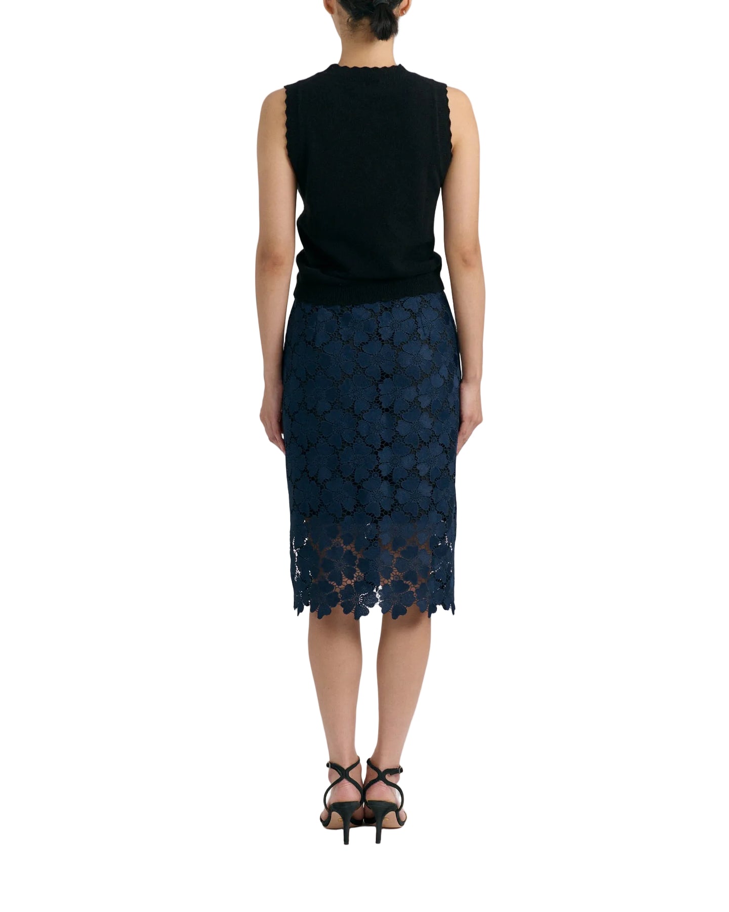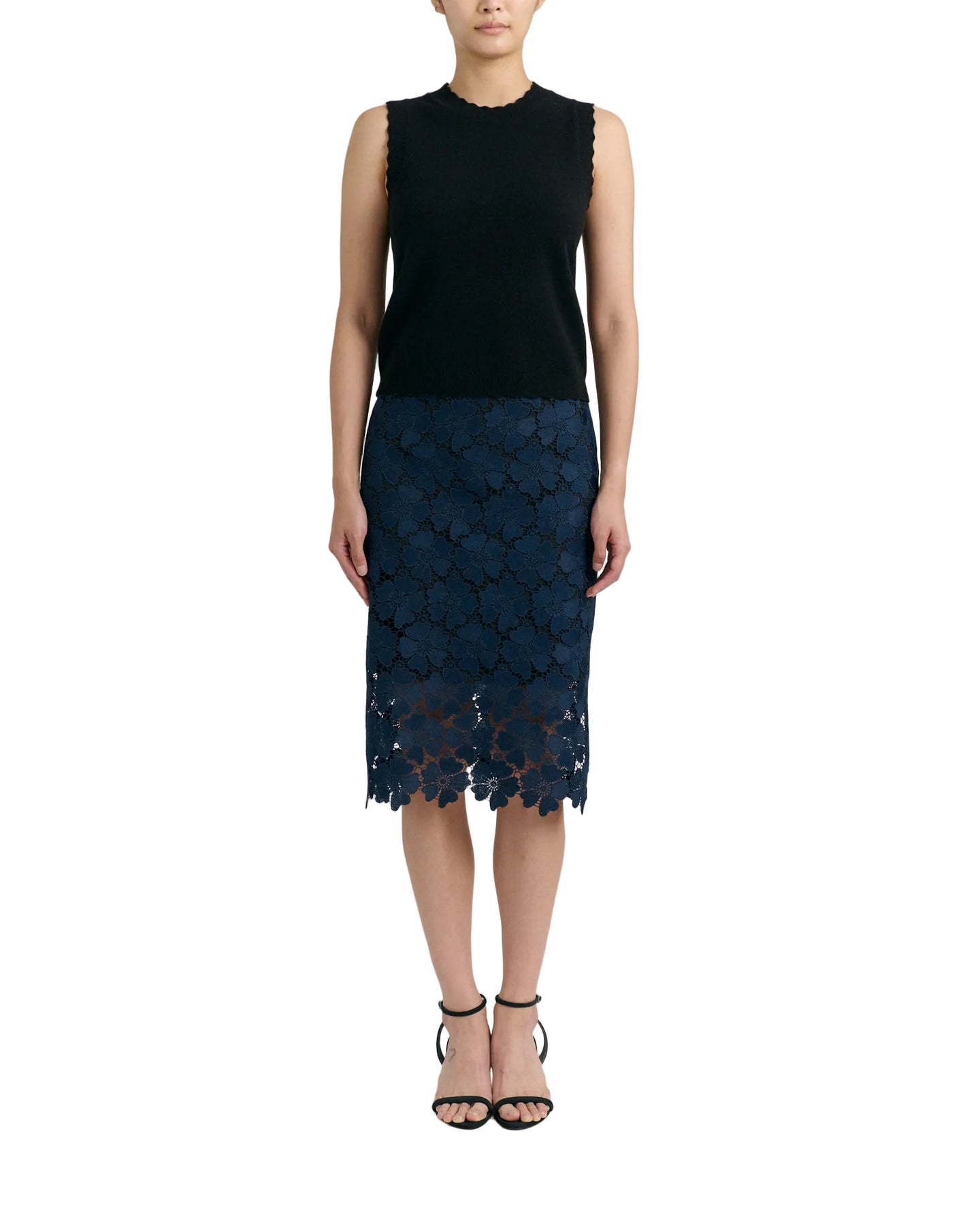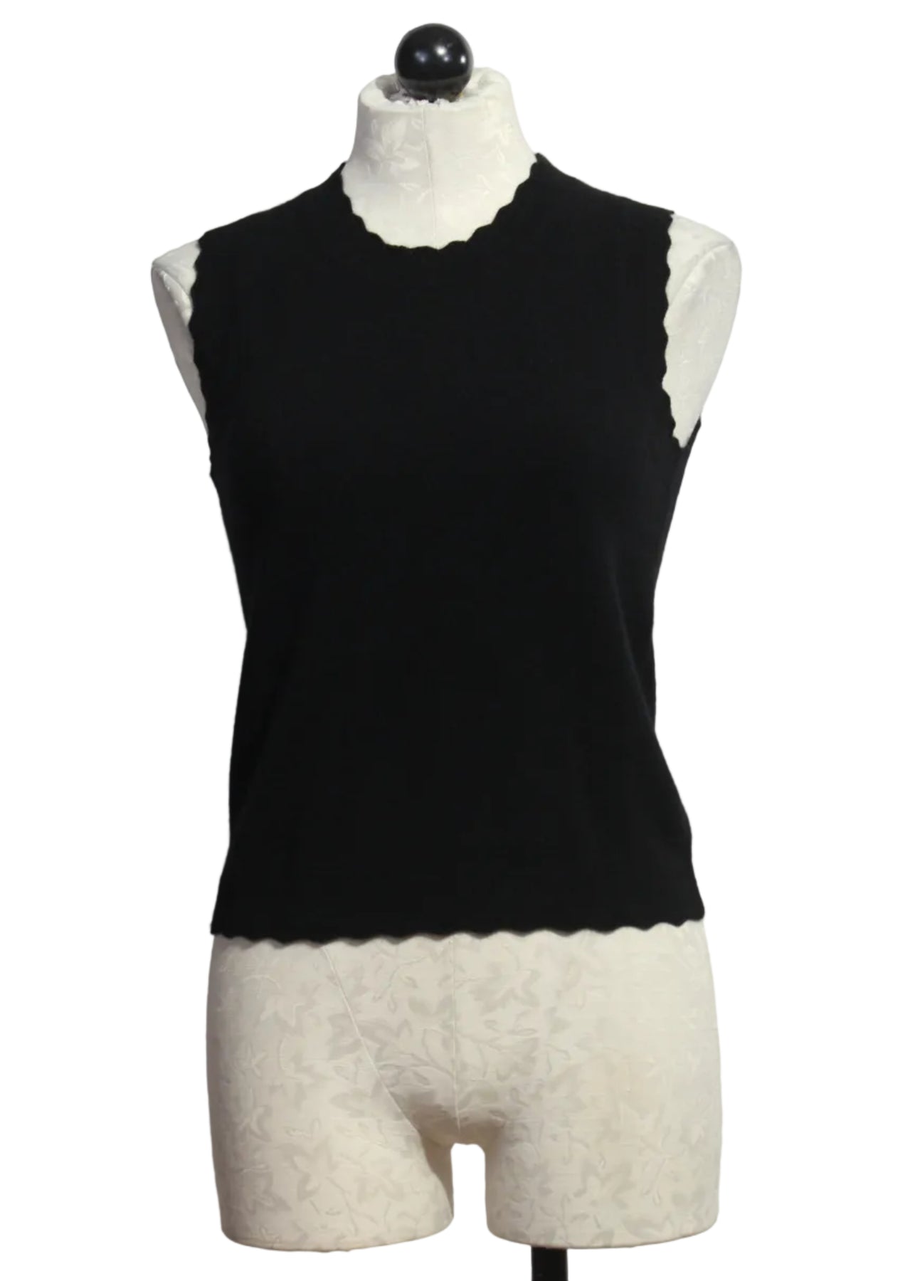 The Black Lou Shell by Cartolina is a 100% cashmere sleeveless tank. The ribbed knit features a scalloped trim. This essential sweater can be worn on its own or paired with its matching Lucy cardigan by Cartolina.