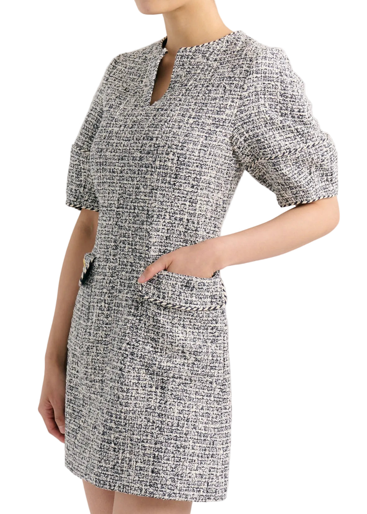 The Chic Short Puff Sleeve Multicolored Black and White Tweed Petra Mini Dress by Cartolina, with contrasting black and white twisted rope trim detail, elevates the classic tweed to a modern style dress.