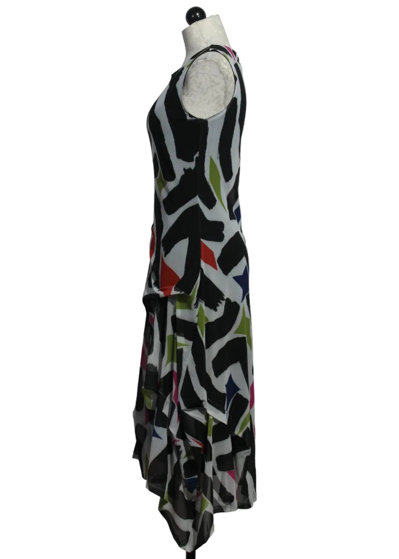 The Colony Dress by Kozan is a beautiful colorful dress that is perfect for a special occasion. This pull-on style sleeveless dress features a rounded neckline, keyhole button in the back, hi-lo hemline, and a mesh overlay for an elevated dramatic look. The stunning dress offers an elegant, fully lined style with a contemporary flair.
