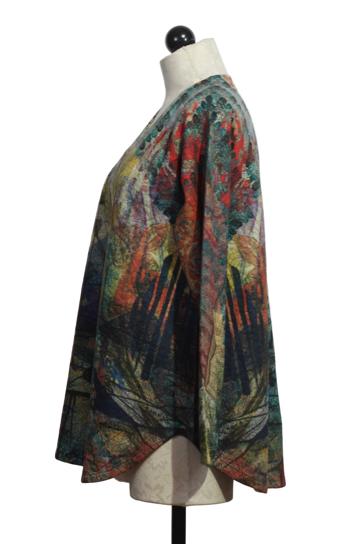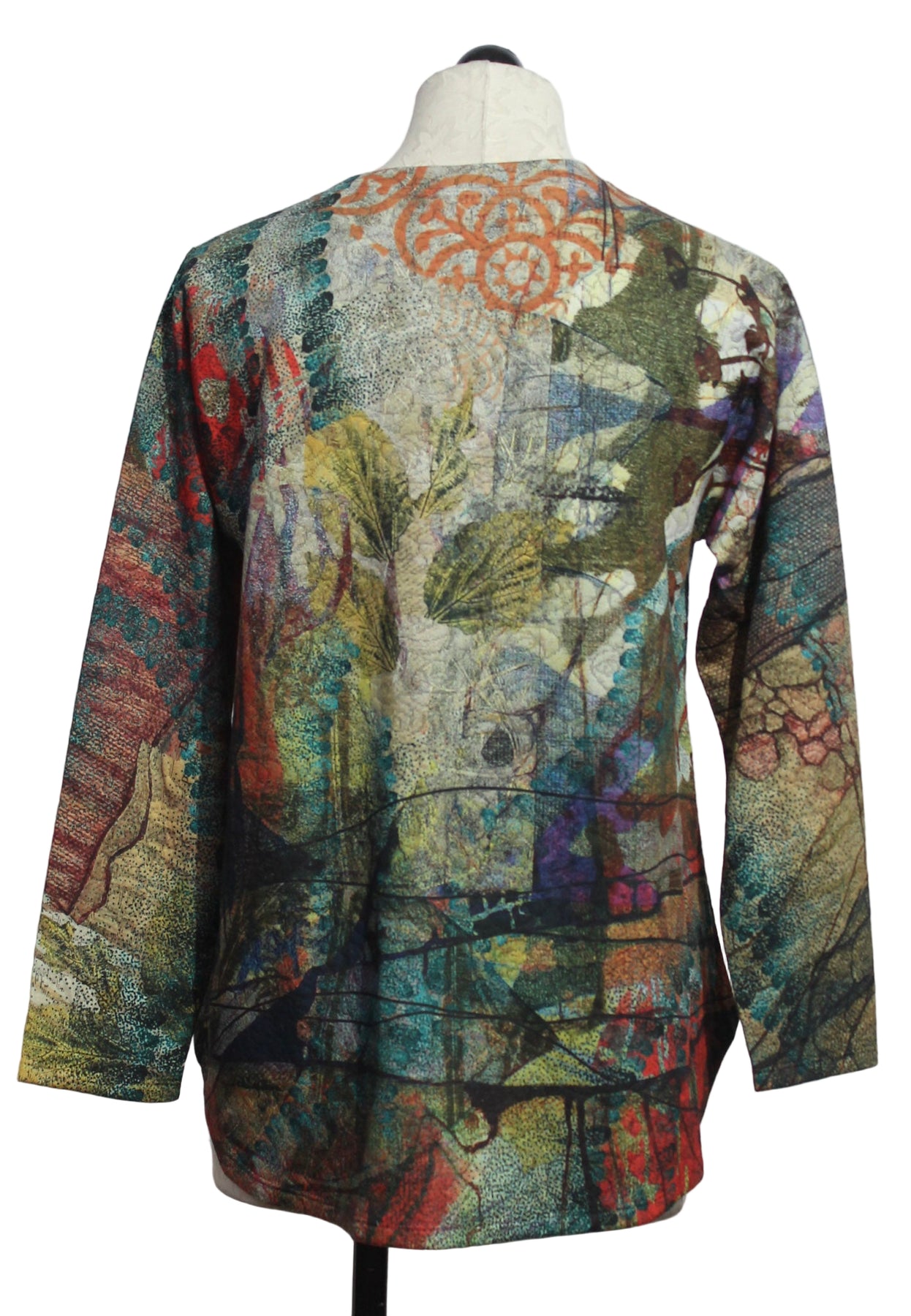 The Long Sleeve V Neck Curved Hem Top by Inoah is fabricated in the Cozy Autumn knit jersey pattern, with a round hem that drapes below the hips. The multi colored pullover consists of a mix of botanicals and graphic motifs in a palette of vibrant fall hues that are balanced by earthy undertones. Bring a subtle artistic touch to your fall-inspired everyday style with this expressive top!