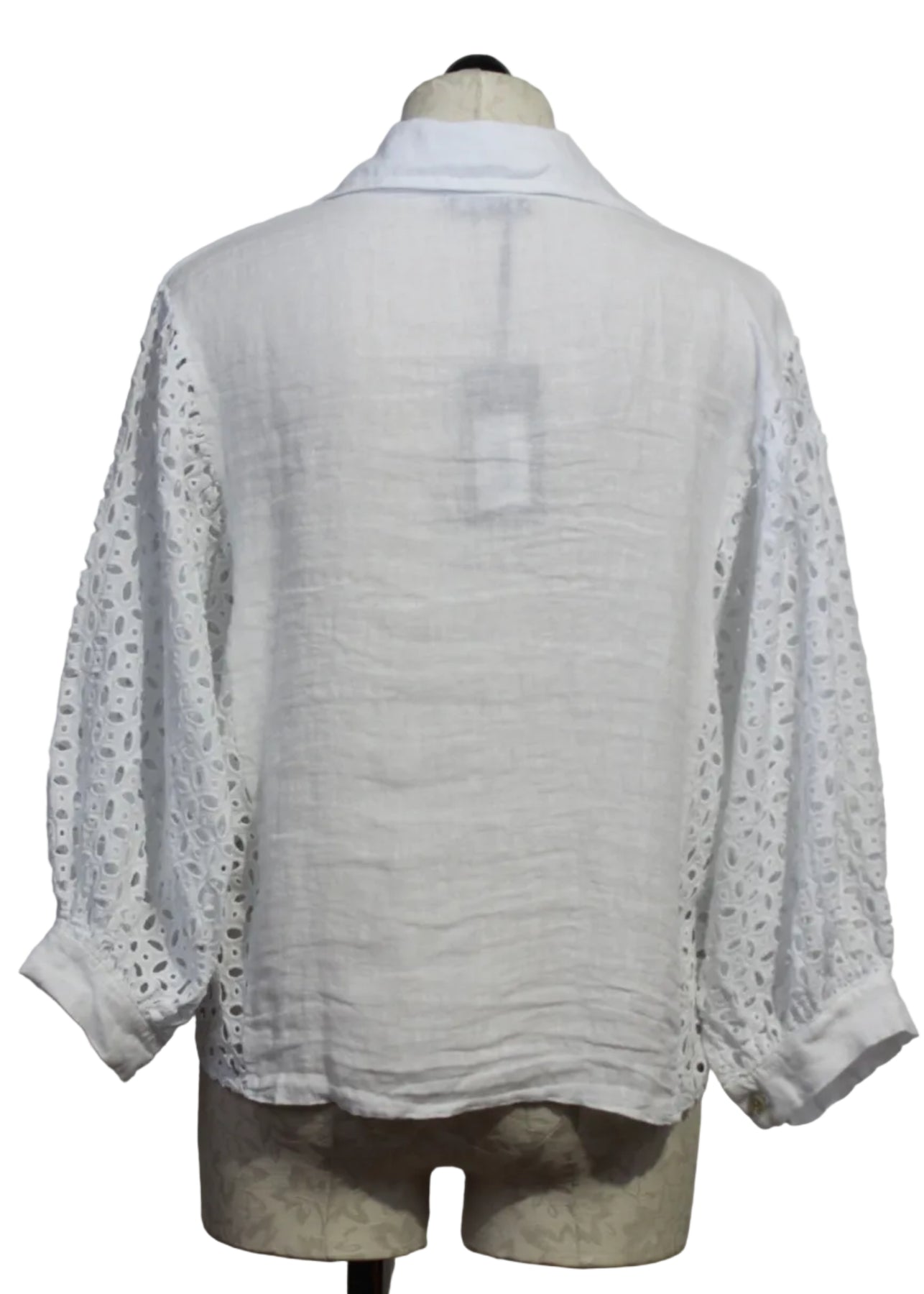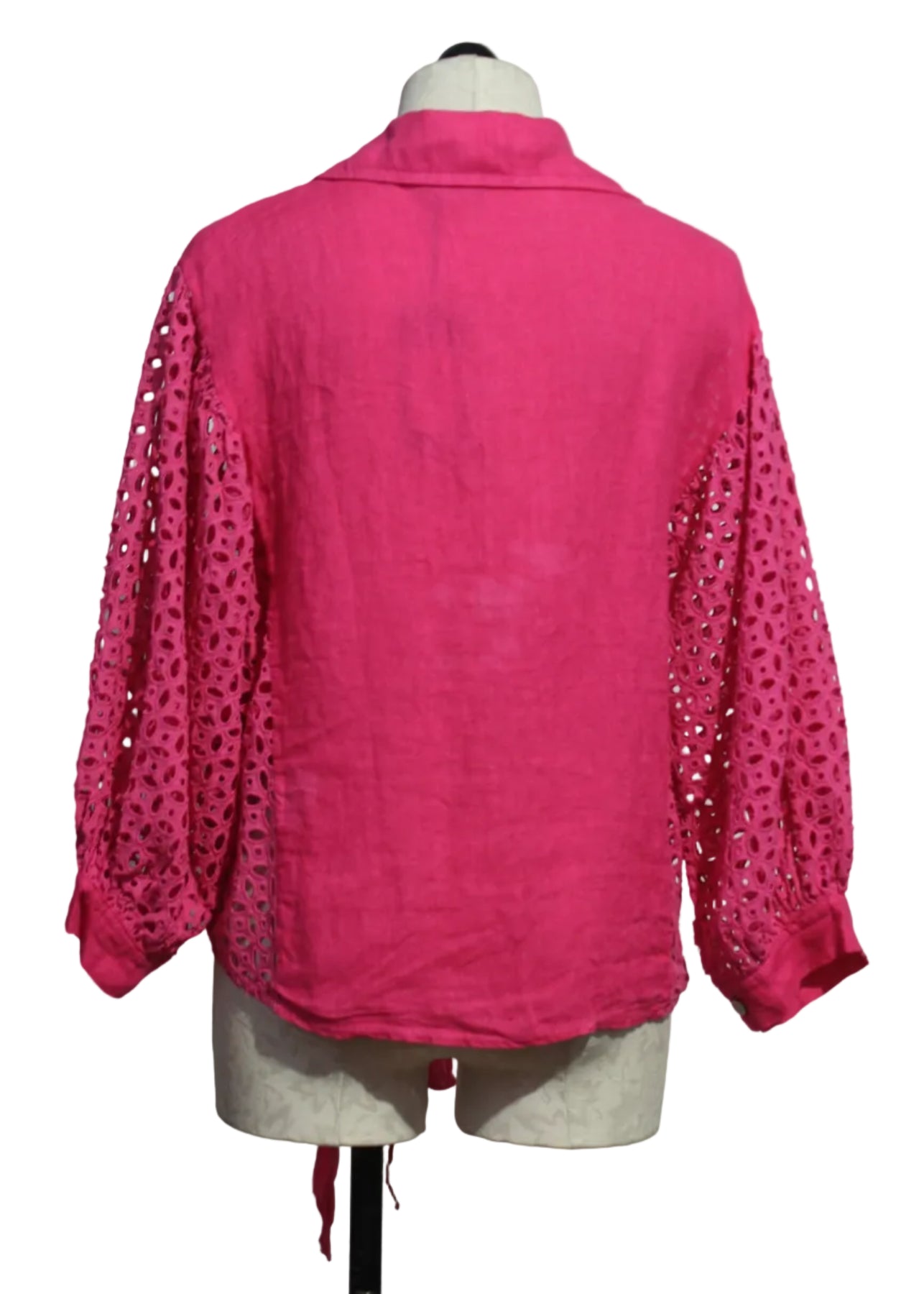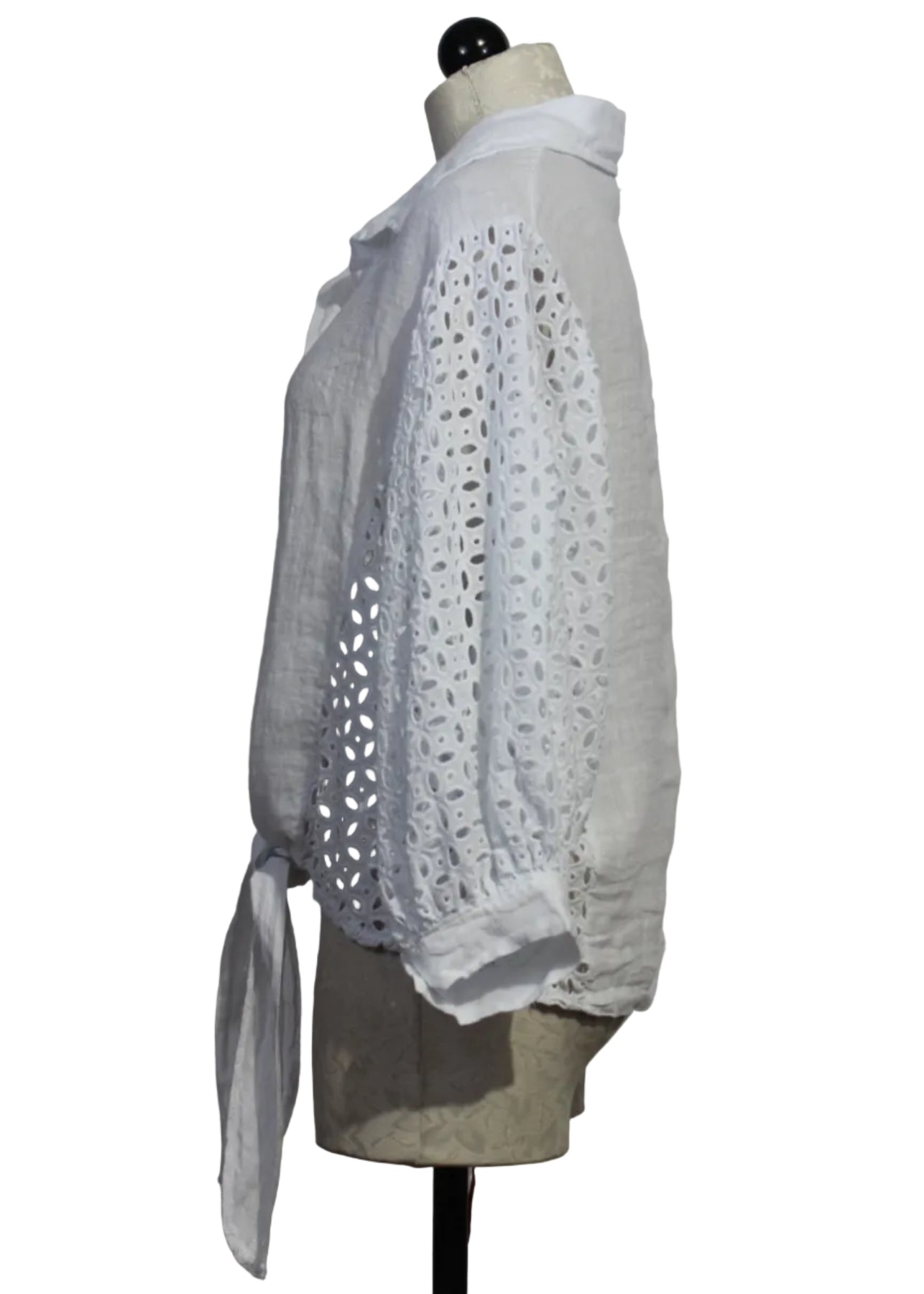 The Linen Tie Waist Top with Eyelet Sleeves by Bella Amore is a top that is full of style! The eyelet blouse is designed with 100% linen and features a shirt collar with a button front, dolman sleeves and a tie at the waistline. This eye-catching top commands attention with its intricate eyelet design on the sides and down the sleeves to create a breezy feel.