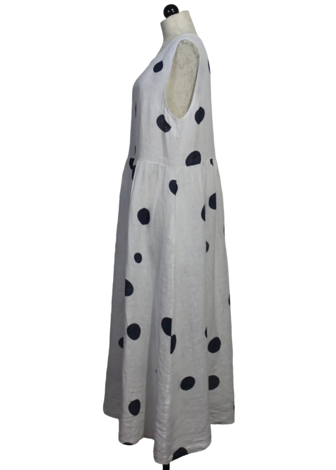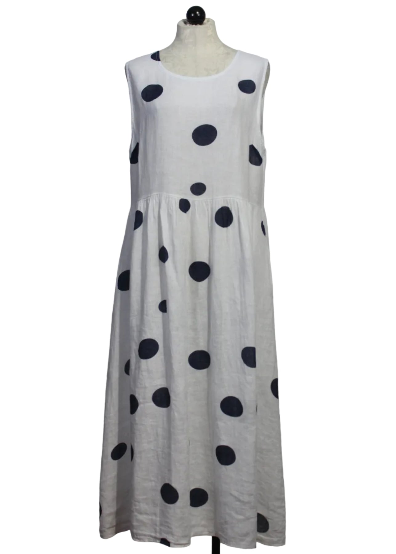 The Sleeveless Polka Dot Dress by Bella Amore is a white linen maxi dress that features a classic navy polka dot print. The chic and playful sleeveless dress is detailed with a high-neckline, a flattering drop waist silhouette, and flowing length. It is the perfect dress for stylish daytime outings or summer events and parties!