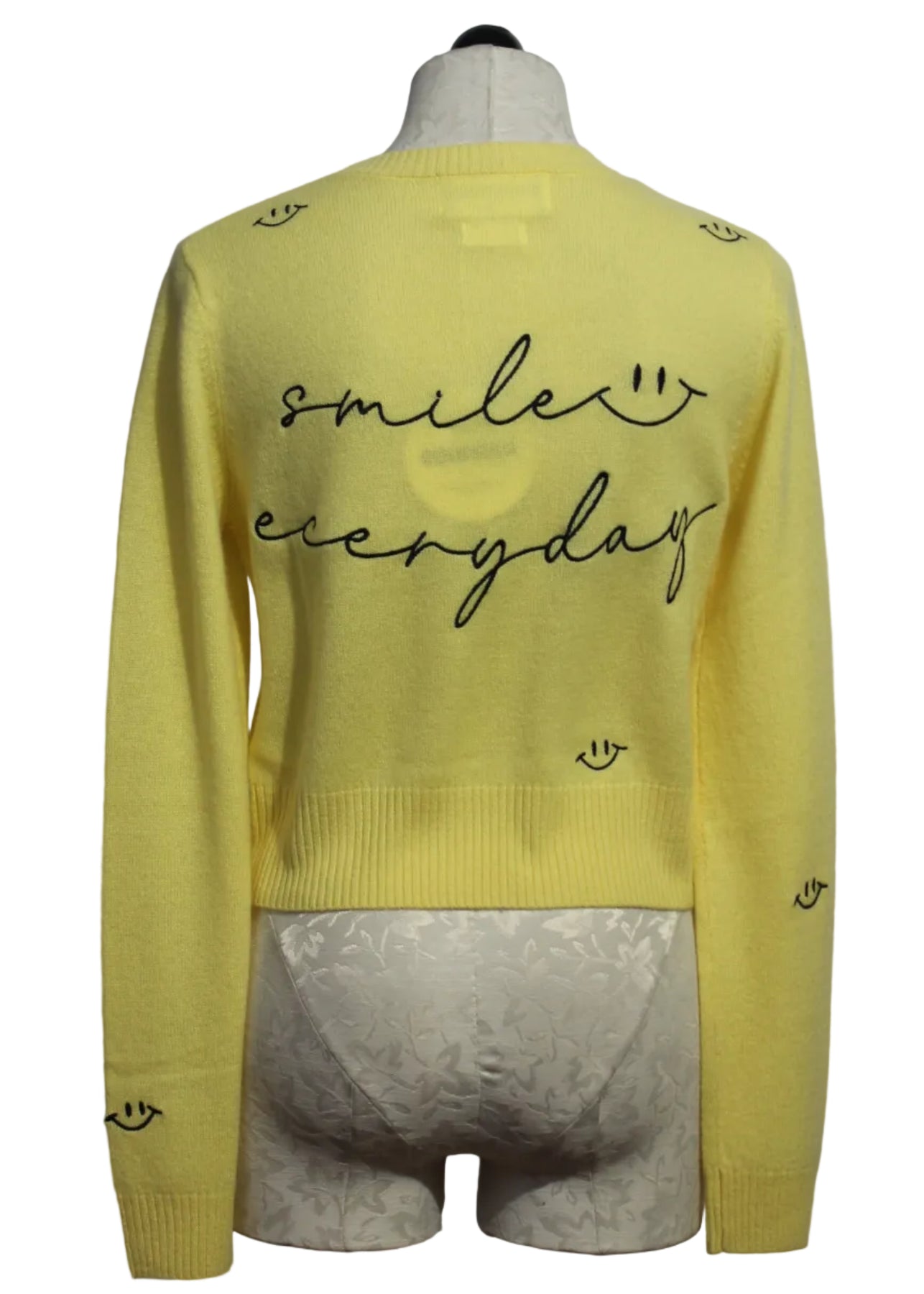 The Womad Smile Everyday Sweater by Colorush is a 100% Cashmere knit with a crew neckline, long sleeves, and a cropped silhouette. Small embroidered smiley faces are scattered across the front of the sweater and the words “Smile Everyday” are written in cursive across the back. Elevate your everyday with style with this bright colored little number.