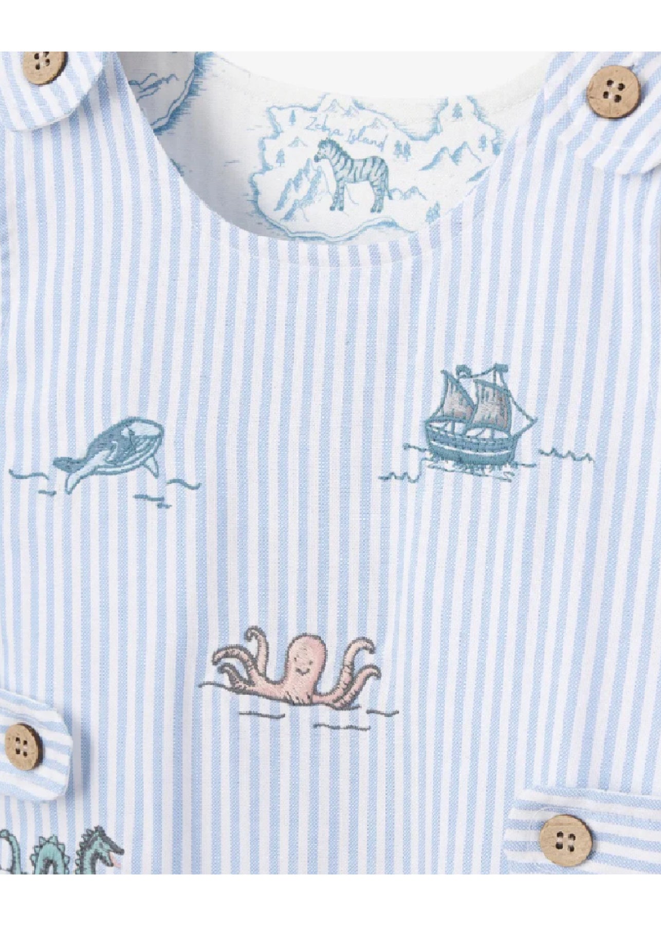 The Oxford Stripe Sea Jon Jon Tank Jumpsuit by Elegant Baby is the epitome of classic baby boy style. It features an embroidered sea creatures on a light blue oxford stripe fabric, making for a comfortable and polished outfit. This timeless staple is perfect for special occasions.