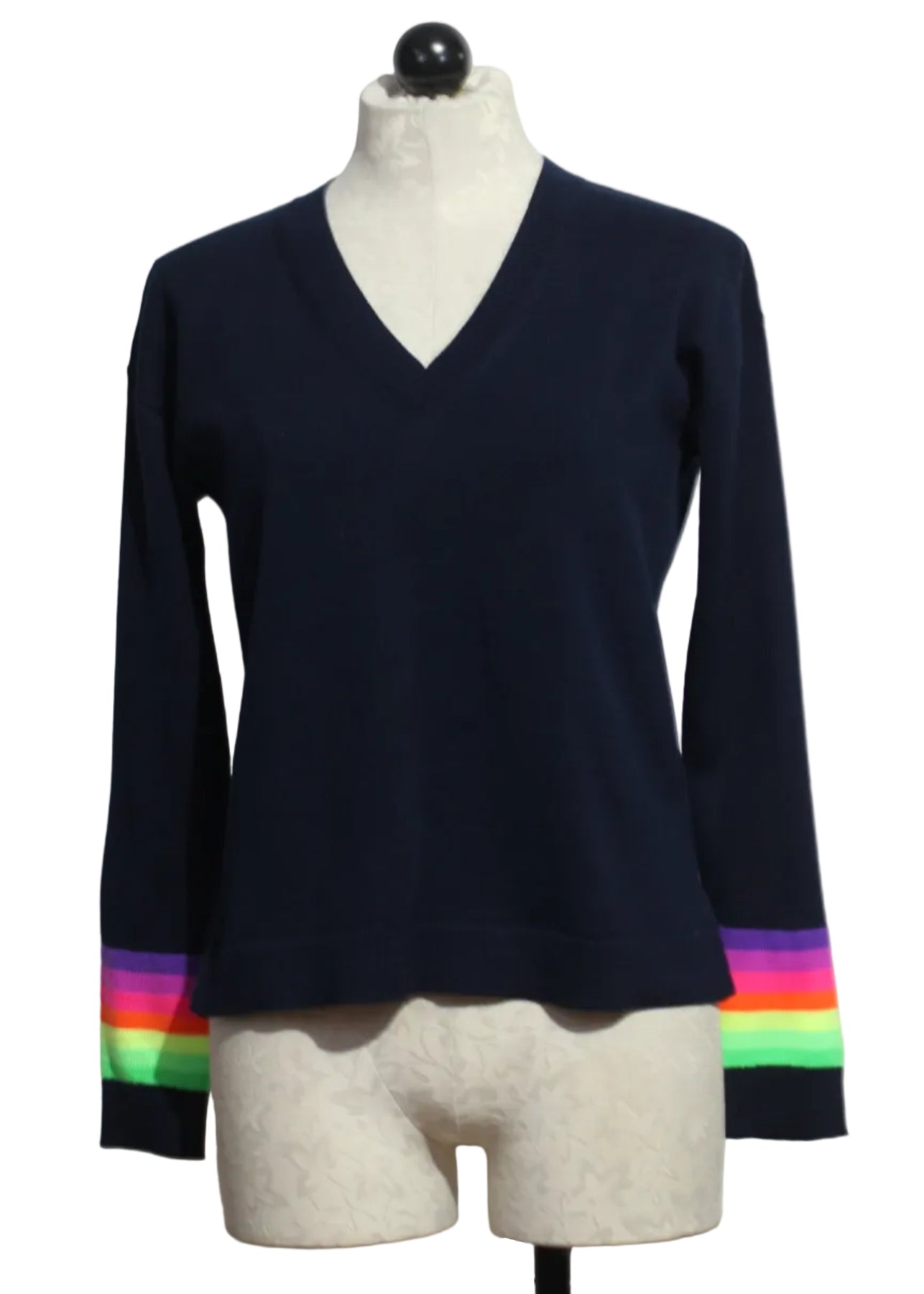 The Brite Side V Neck Sweater by Lisa Todd will add a dose of happy color to your wardrobe with rainbow stripes down the sleeves and around the cuffs. This relaxed cotton knit features a modern V-neck pullover silhouette, a drop shoulder, and a ribbed cuff, neck, and hem trim. This cheerful staple is perfect for every season and will have you bringing the sunshine wherever you go!