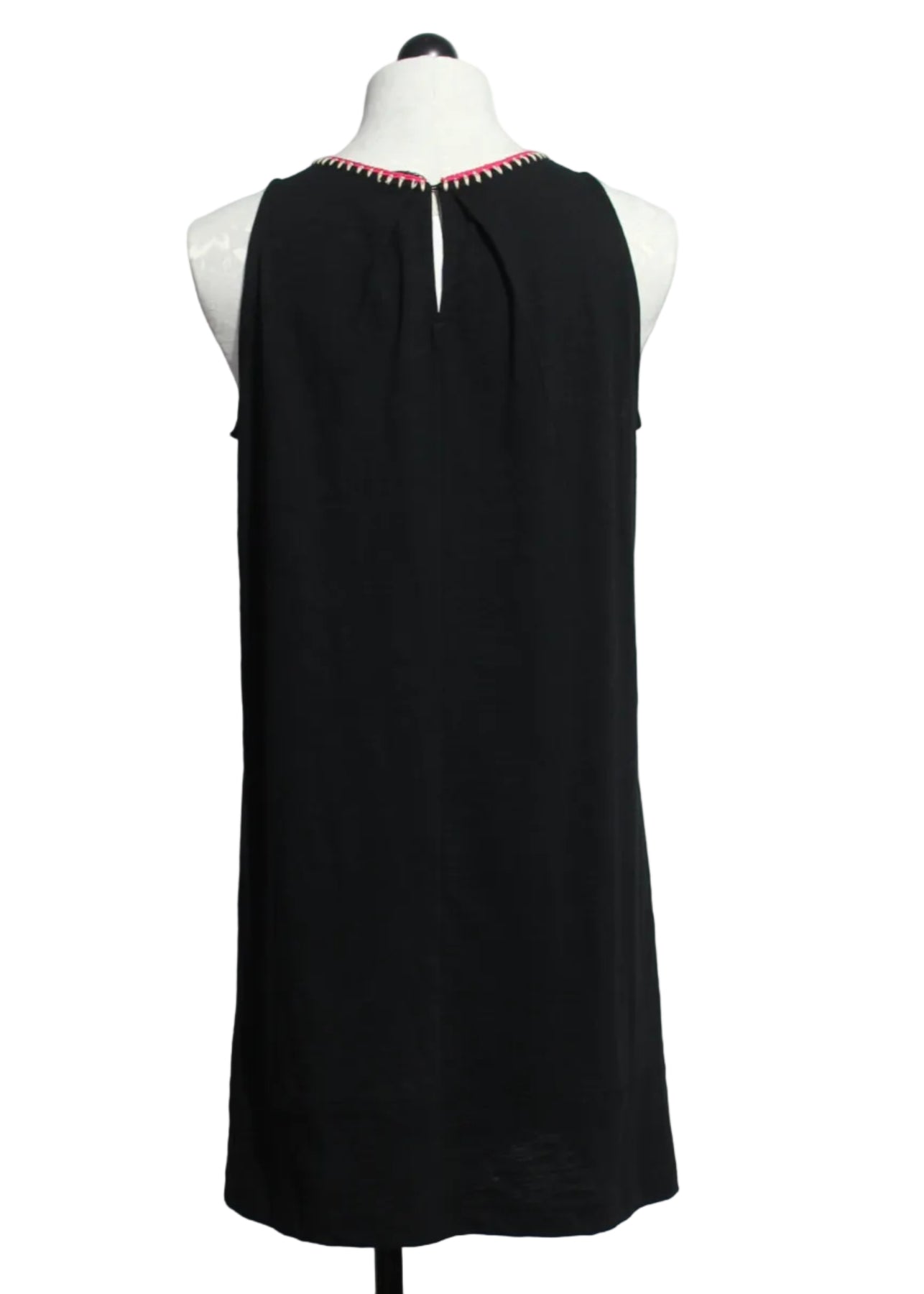 The Summer Swing Dress by Lisa Todd is a black sleeveless piece with a multicolored whipstitched neckline. This simple dress features a flowy silhouette that will flatter all body types. It is the perfect piece to pair with sneakers or sandals this season.
