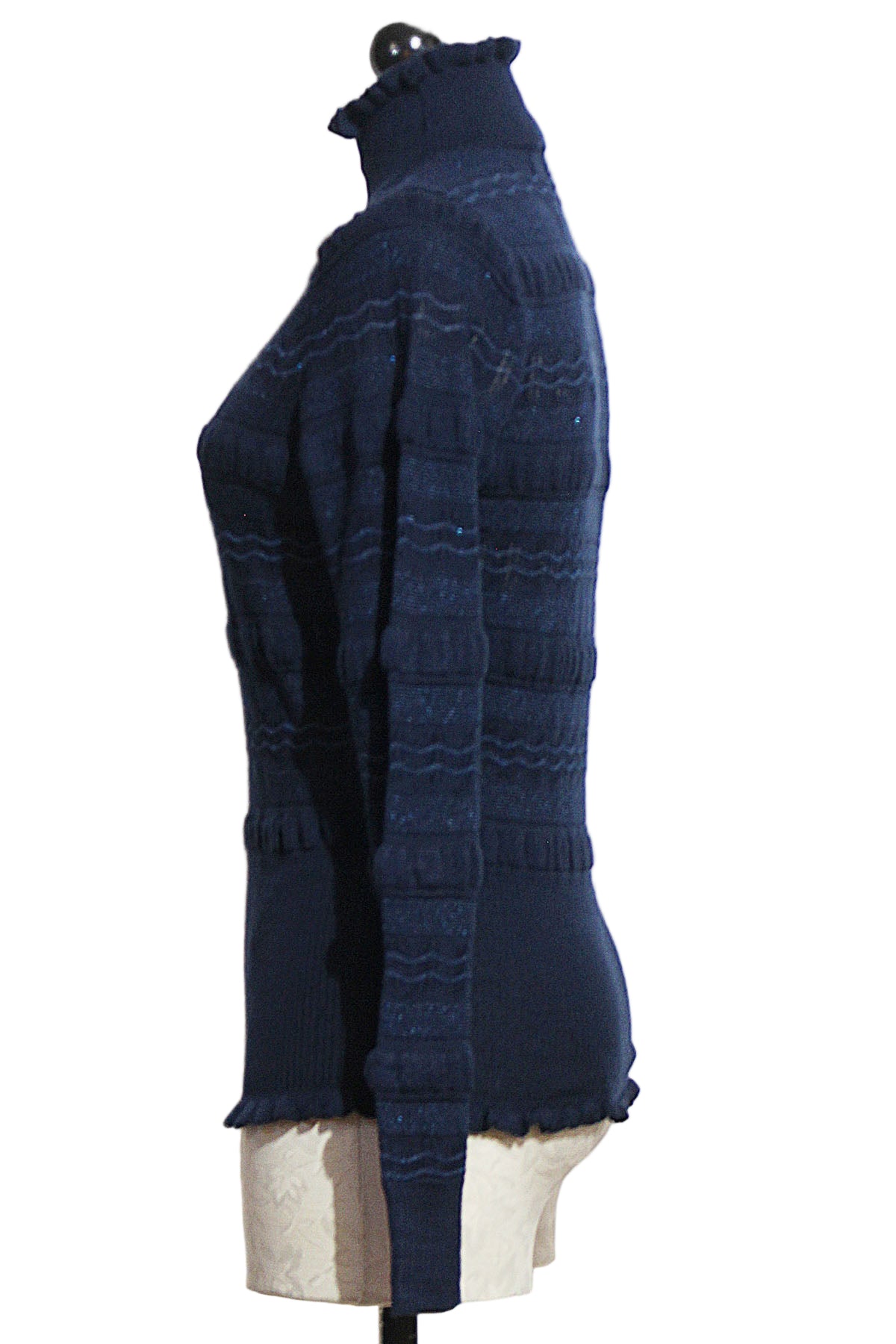The Adison Top by Marie Oliver is your new favorite body-skimming turtleneck in the color Pacific. The delicate striped pointelle knit features an allover folded ruffle turtleneck and a metallic yarn for a subtle shimmer. This navy hue will pair seamlessly with a variety of seasonal separates.