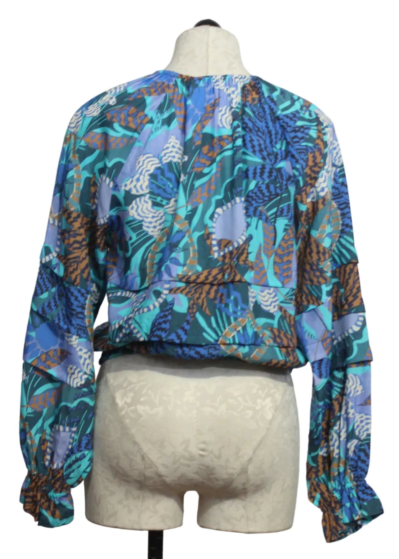 The Umi Blouse by Marie Oliver is a slipover with double ties in the front. The electric blue botanical print underscores the bohemian lines of this peasant-style garment with a ruffle bottom, long sleeves, and an elastic waistband and cuffs. The relaxed cropped fit of this blouse pairs nicely with skirts, pants, and shorts.
