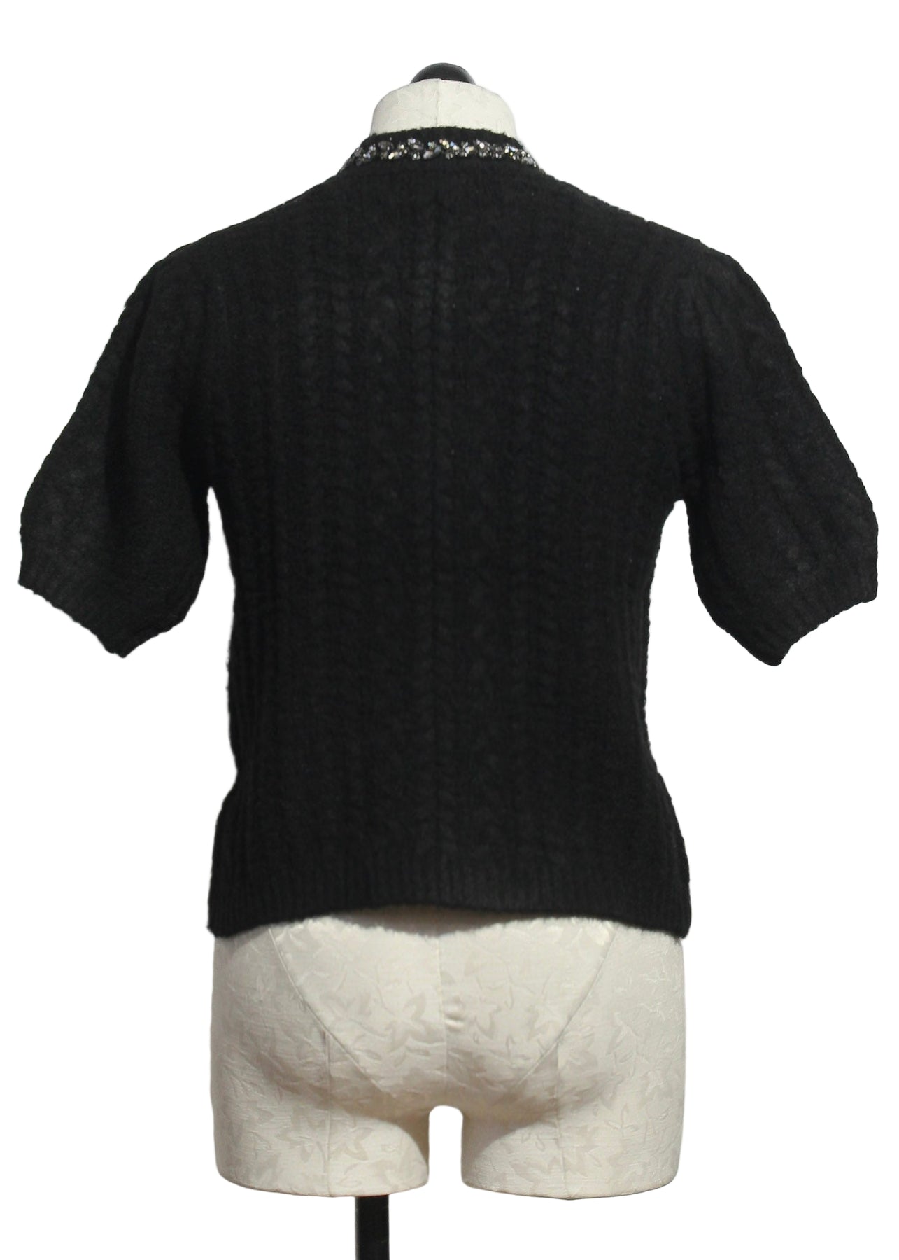 The Short Sleeve Maxwell Cardigan by John and Jenn features a classic fit with a textured pattern and highlighted by a pearl and crystal collar for a preppy flair. Crafted from an acrylic knit, it offers a crewneck design and a five button front closure. The Glitzy Night colored sweater is cropped at the waist and pairs effortlessly with skirts or denim for a chic day-to night look.