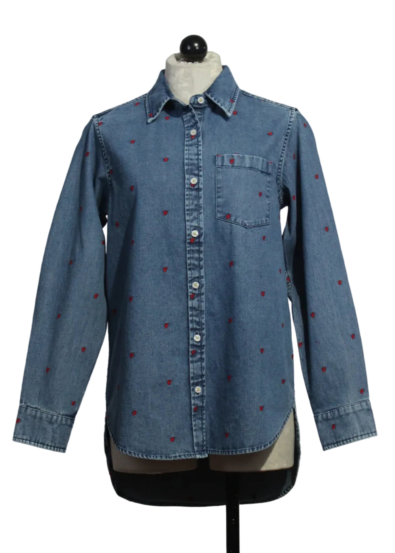 The Mia Tiny Hearts Denim Shirt by Kerri Rosenthal is embroidered with Kerri’s ‘Tiny Hearts’ artwork. This button front shirt is designed with 100% cotton, and features a shirt collar, single pocket, and a relaxed fit. It is a great piece to layer or wear on its own.