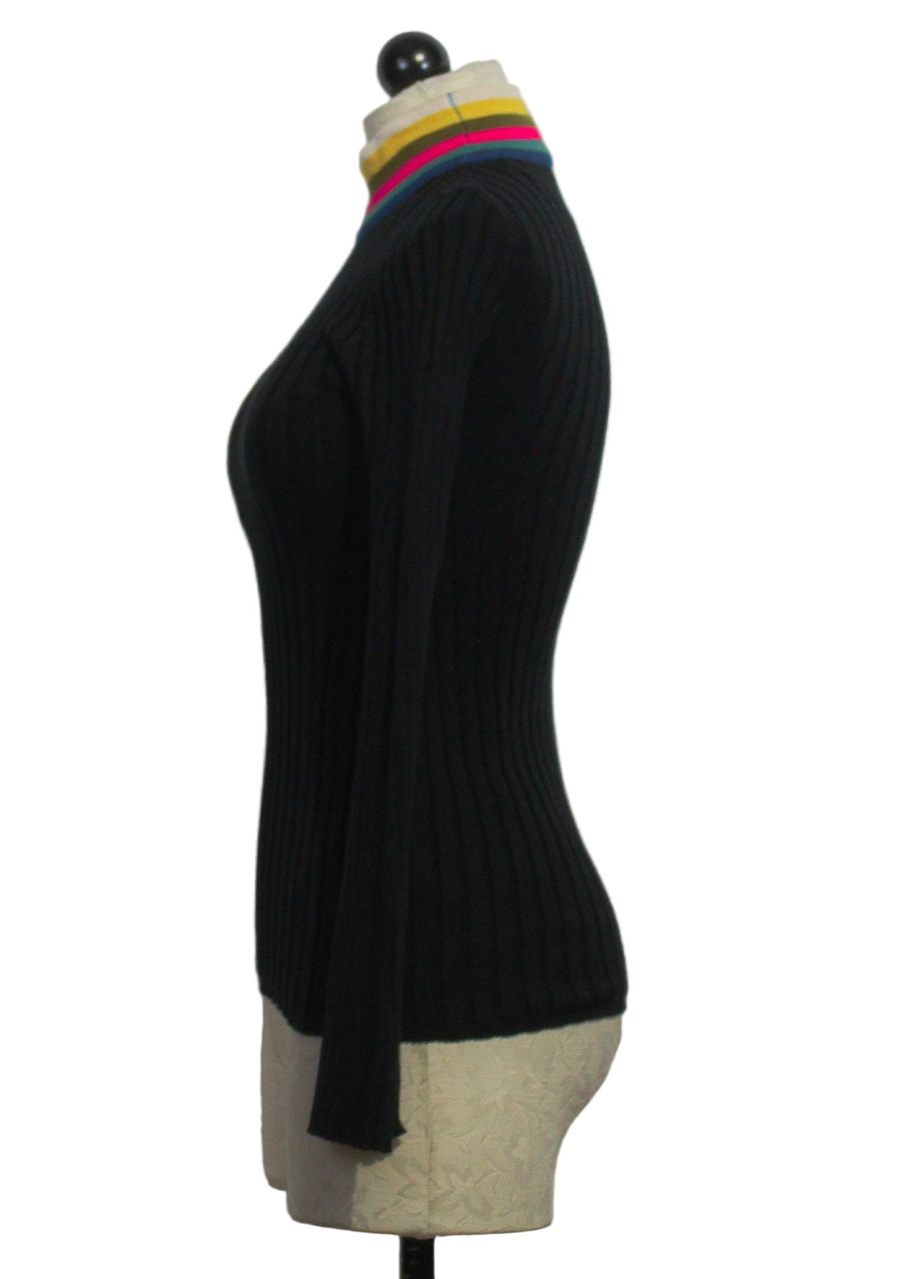 The Lerate GOTS T Shirt by SKFK is a black, lightweight ribbed knit top that features a warm toned multicolored mock turtleneck. The Certified Organic piece features long flared sleeves and a soft, breathable knit fabric that feels gentle on your skin. This versatile knit pairs perfectly with everything from tailored trousers to relaxed denim.