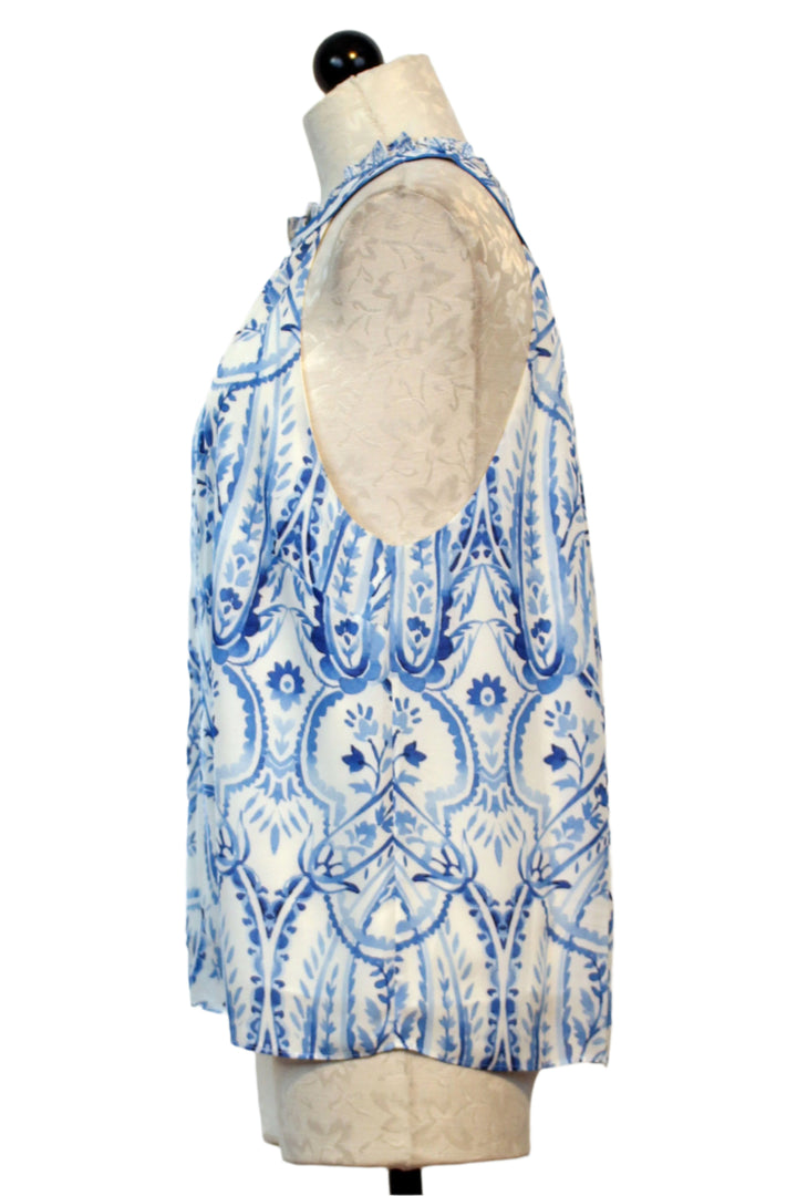 The Porcelain Deco Hollie Top by Caballero is a halter-style top with a straight fit. It is fabricated in the Porcelain Deco print in a white and French blue color that is sophisticated and timeless. Featuring a modern zipper and delicate shirring, this charming sleeveless blouse is perfect for any occasion.