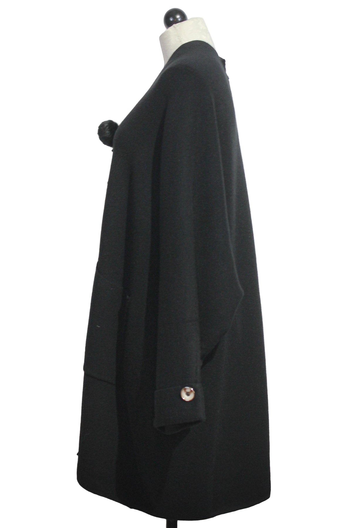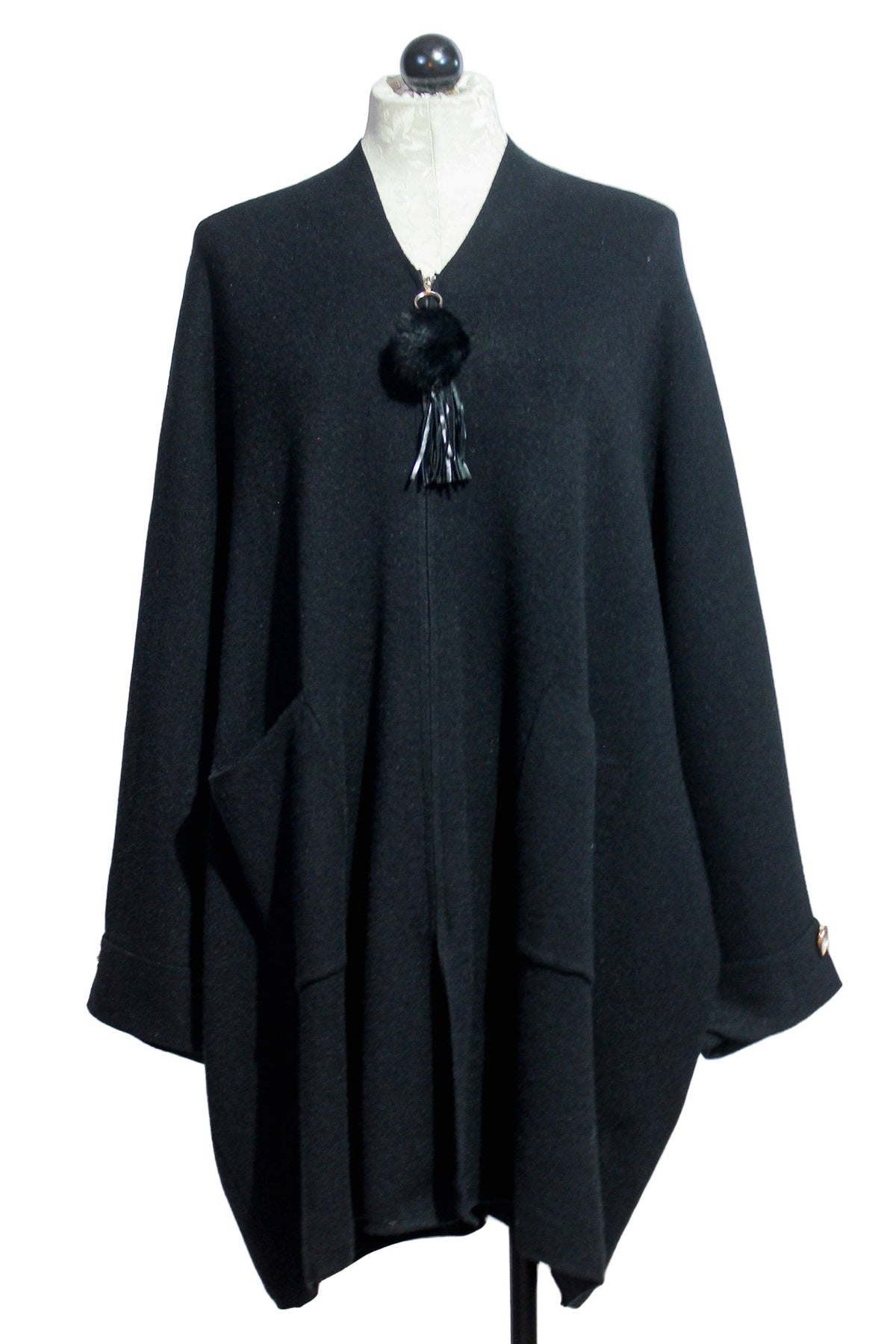 The Black Zip Front Dolman Sleeve Cardigan by Nikky is a must have for your wardrobe during the cold-weather months. The poncho like sweater features an oversized silhouette that falls at your knees, a zippered front with a tassel and faux fur zipper pull, a dolman cuff sleeve with button, and large front pockets. Pair it with denim and loafers or with a dress and boots for a cozy and absolutely elegant outfit.